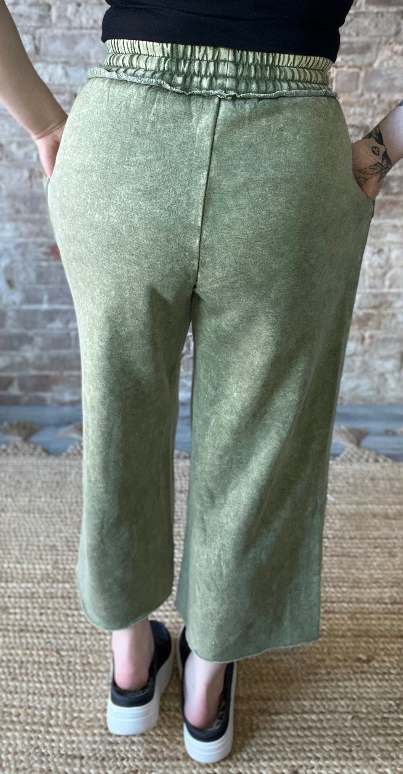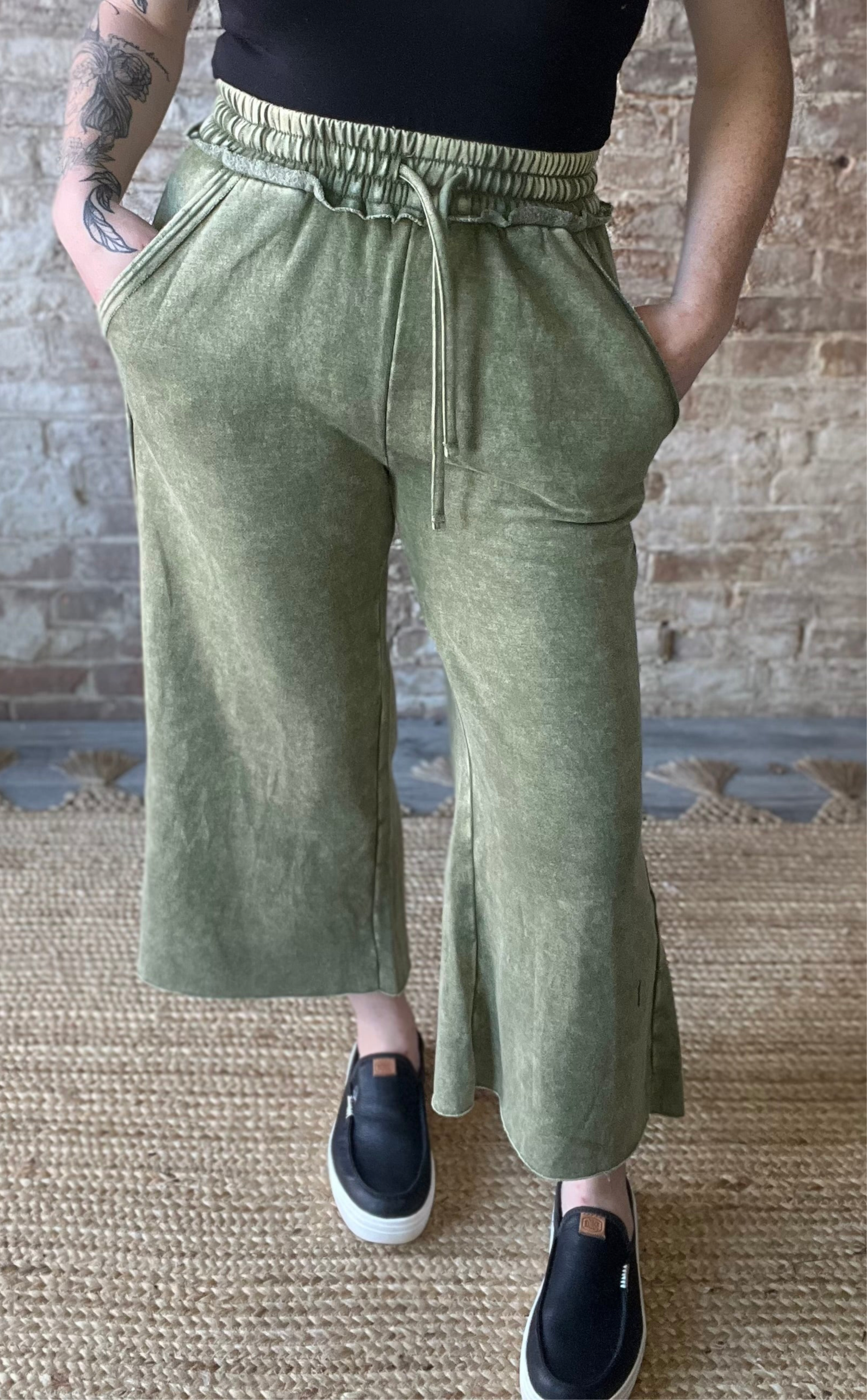 Slip into comfort with these Acid Washed Fleece Palazzo Sweatpants in Light Olive. Featuring a relaxed, wide-leg fit and handy pockets, they combine cozy warmth with effortless style — perfect for lounging, running errands, or adding a playful twist to casual outfits.