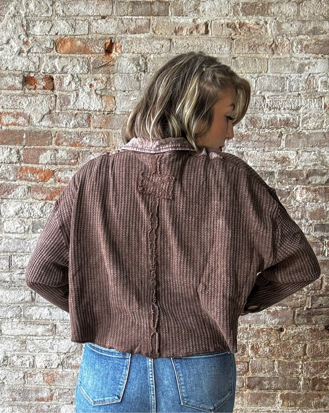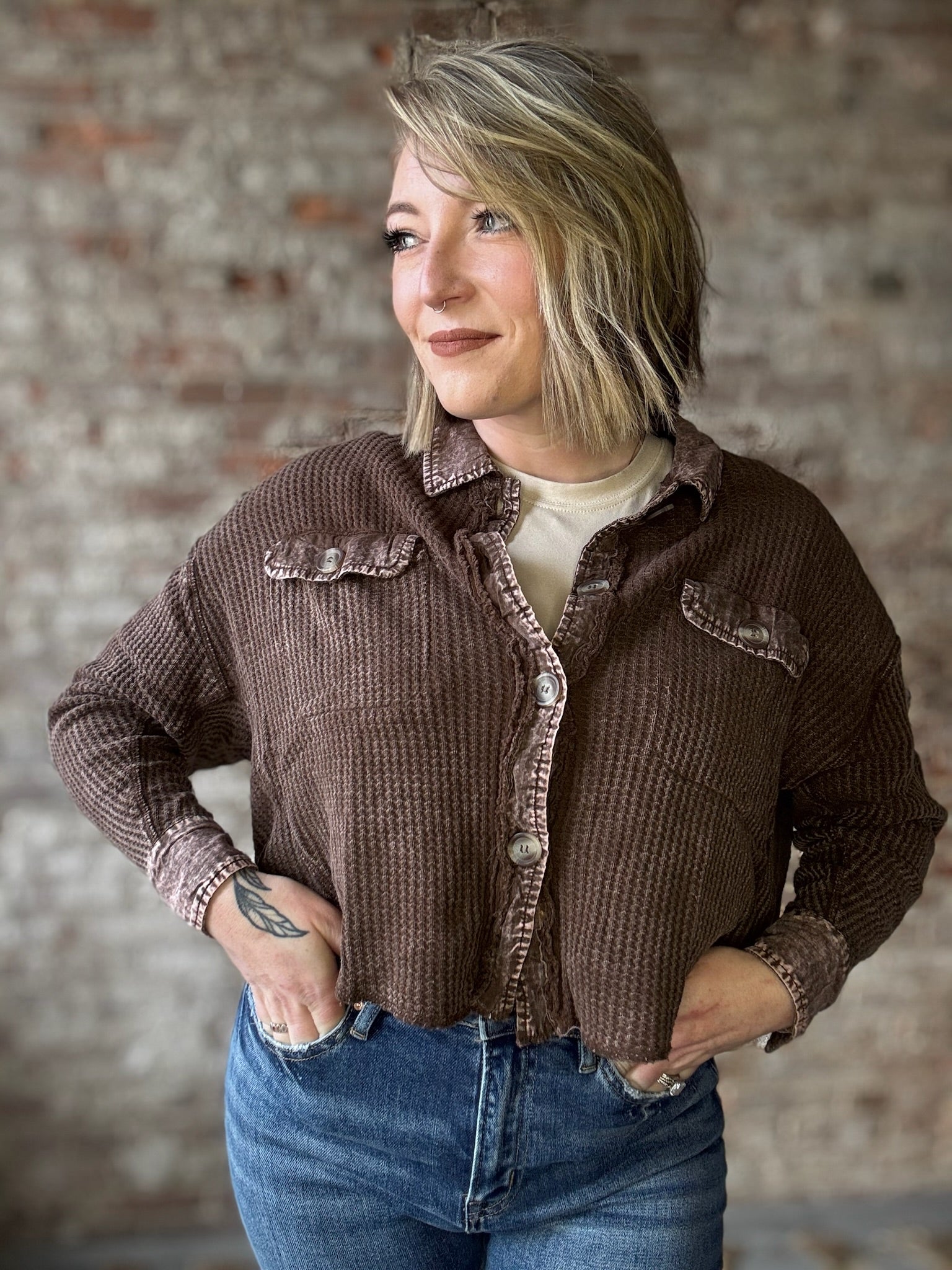 Stay cozy and stylish with this Acid Wash Waffle Oversized Cropped Shacket in brown. Its soft waffle texture and relaxed fit make it perfect for layering on cooler days, while the cropped cut adds a fun, flirty edge to your look. Whether you're out grabbing coffee or enjoying a casual day out, this shacket brings playful comfort to your everyday wardrobe.