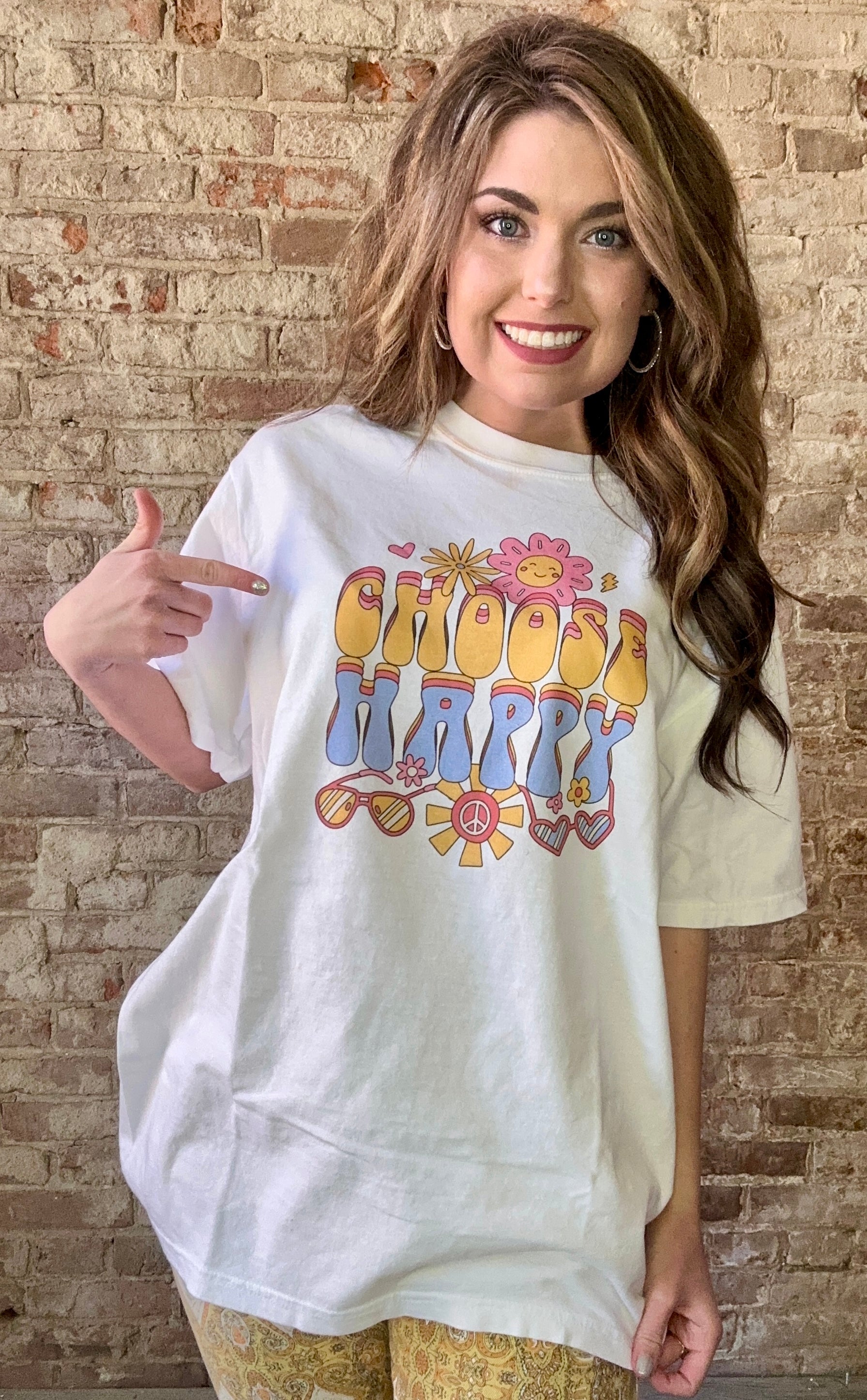 Grab this Choose HAPPY tee and let your good vibes shine! It's the perfect fit for any occasion and the super soft fabric will keep you cozy all day long. Put a smile on your face and spread the cheer- this t-shirt is sure to make those around you Choose HAPPY too!