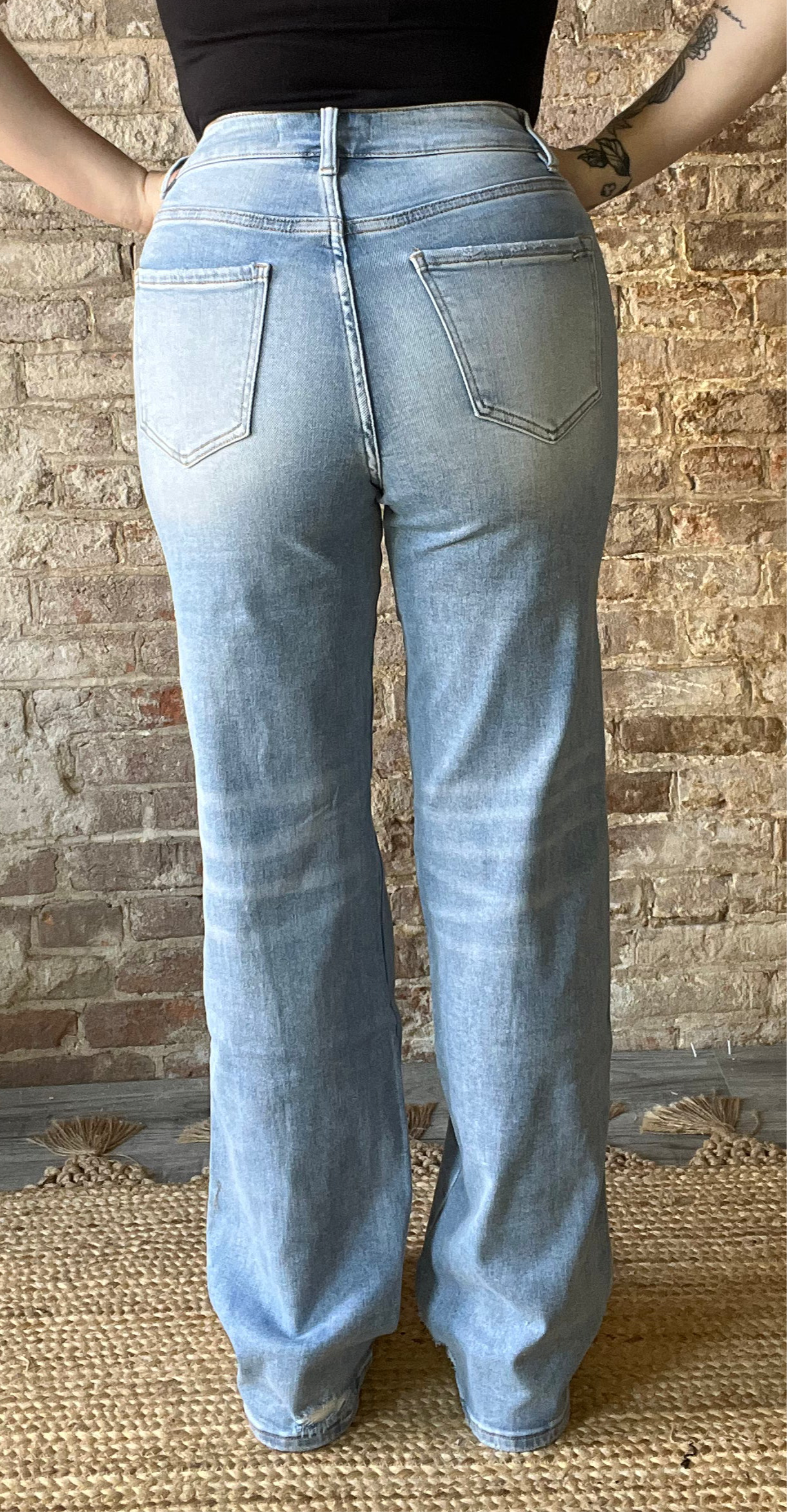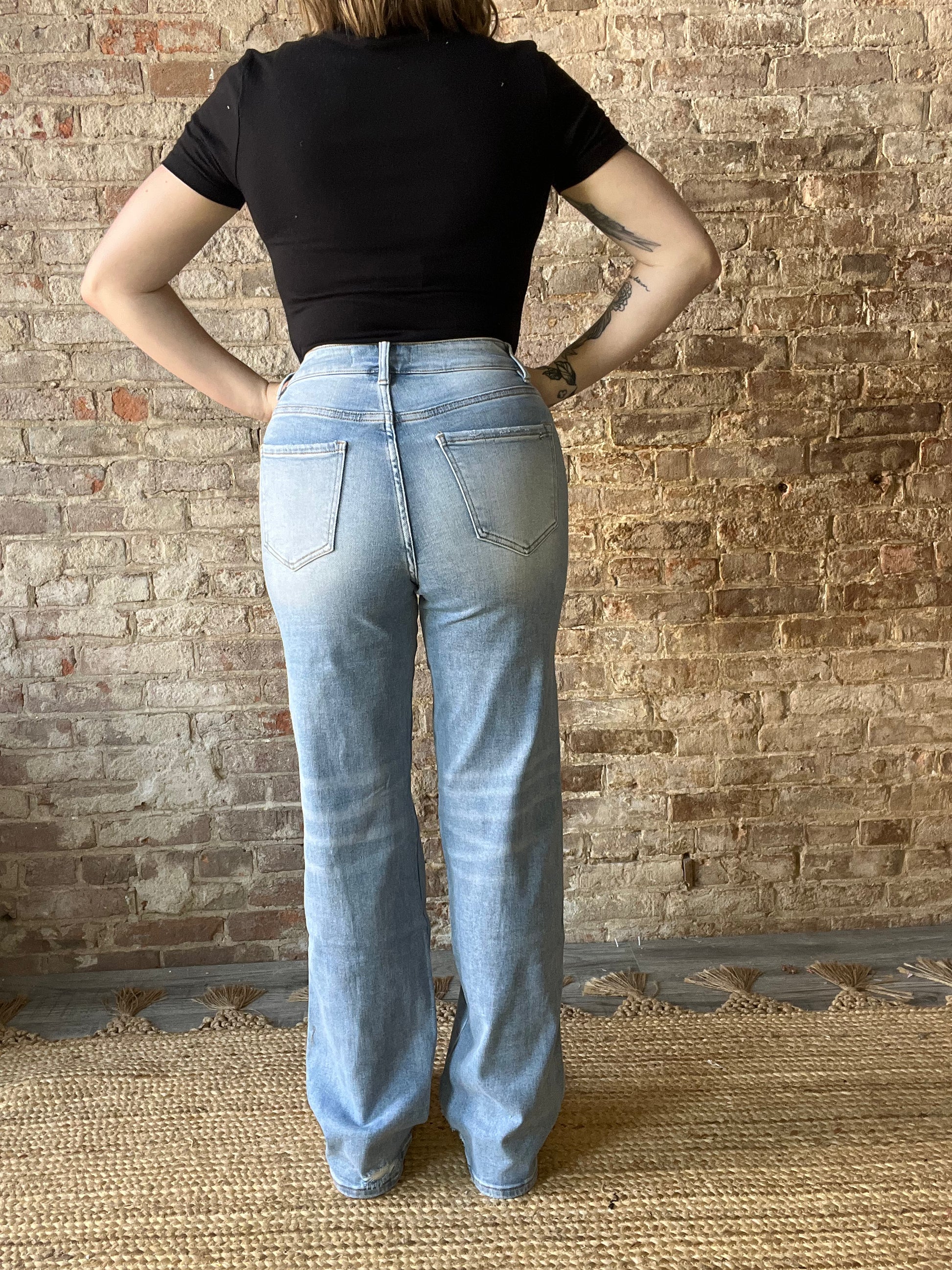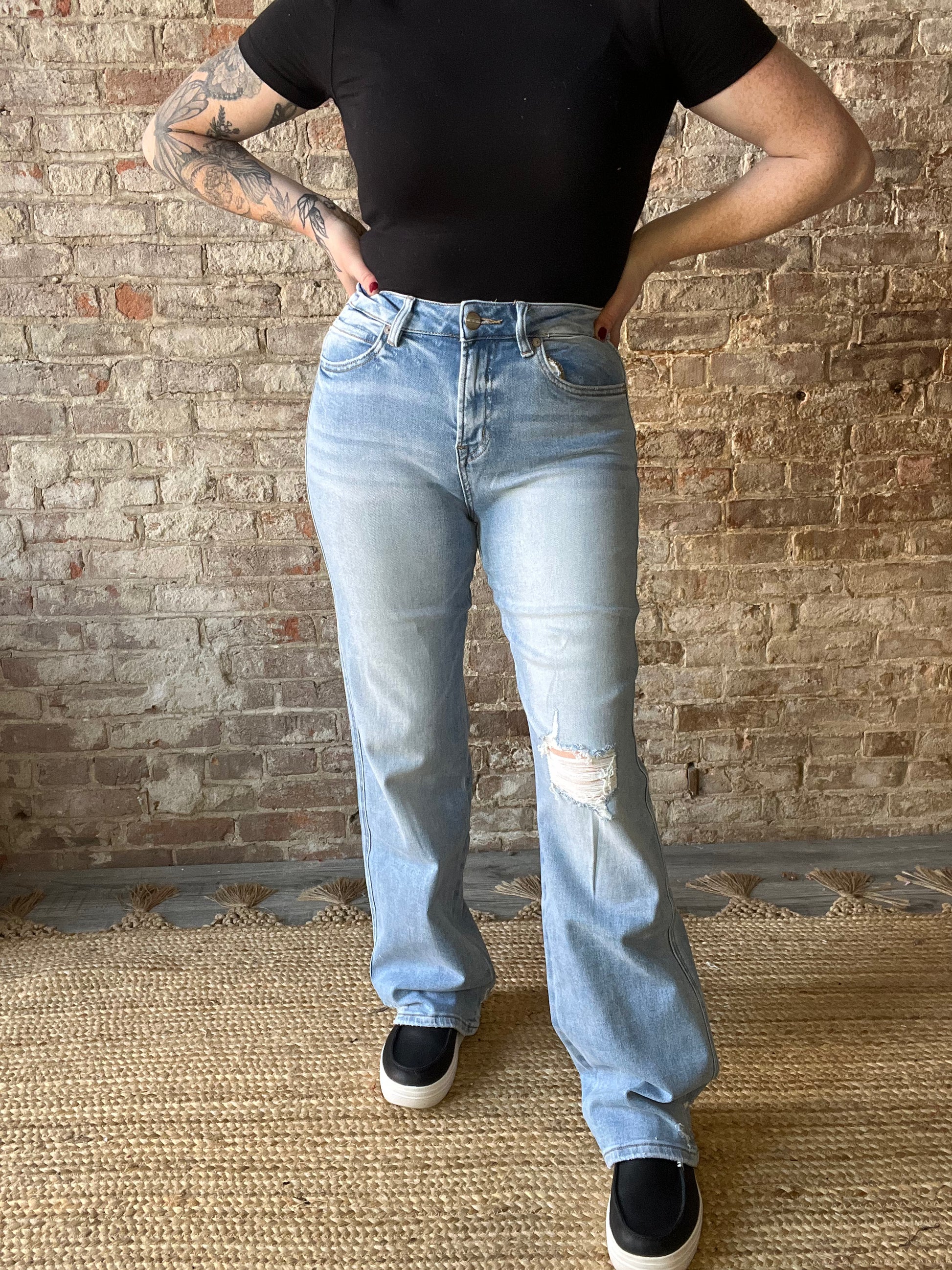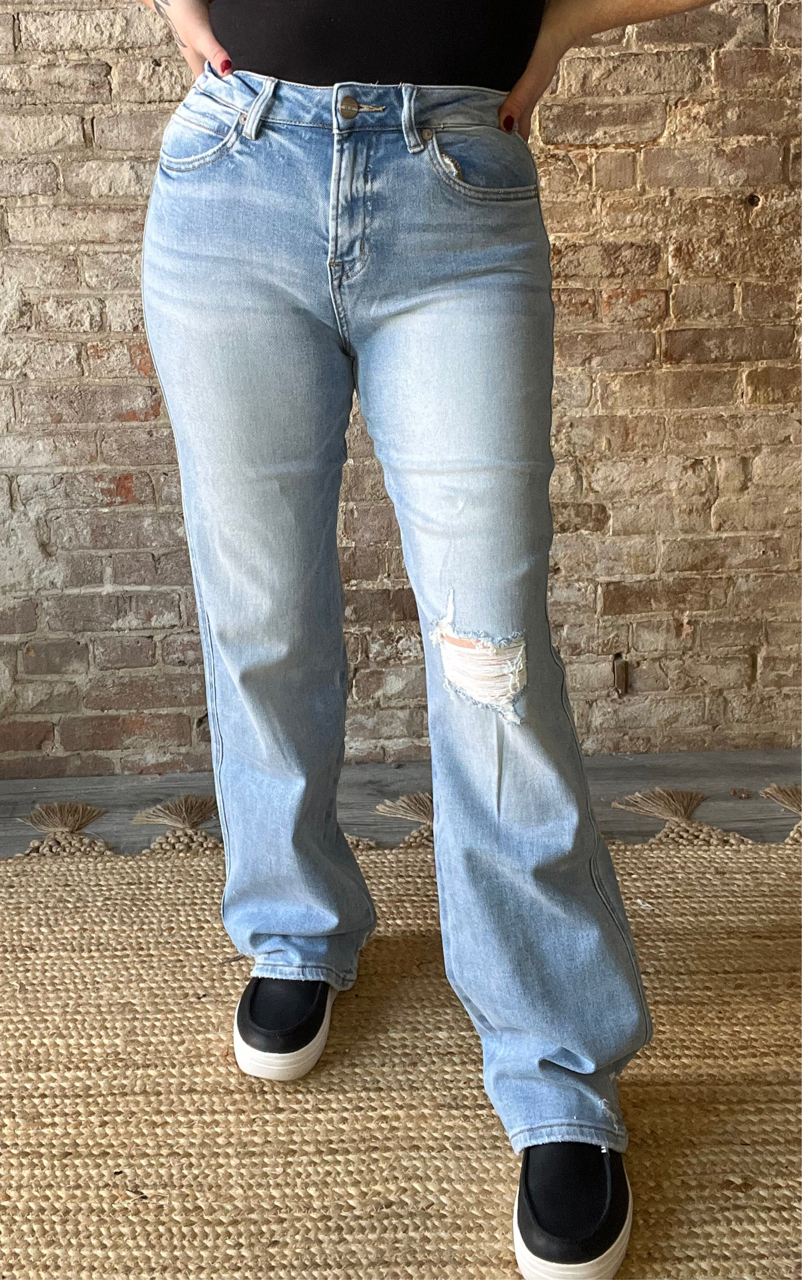 Step out in style with these High Rise Wide Leg jeans featuring a trendy distressed knee. Crafted from a comfy blend of 93% cotton, 5% polyester, and 2% spandex, they offer just the right stretch for all-day wear. With a flattering 10.5" front rise, a long 33" inseam, and a wide 20.5" leg opening, these jeans bring both comfort and flair to your look. Perfect for adding a fun, carefree vibe to any outfit!
