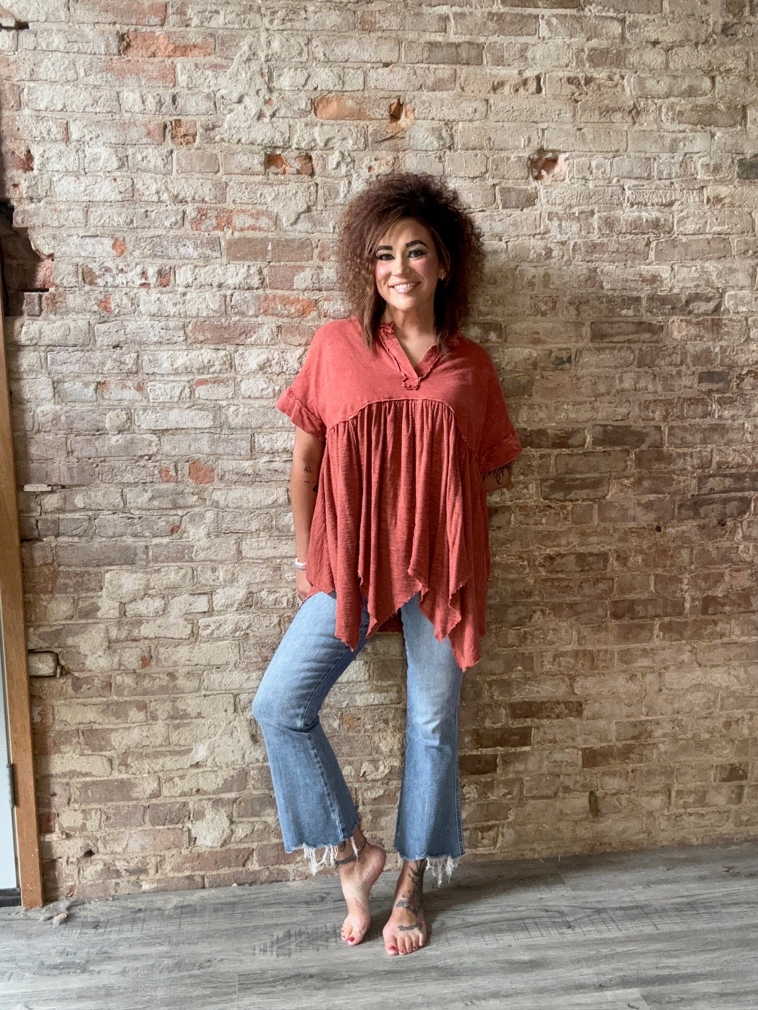 Mineral Washed Boho Flowy Tunic ~ Burnt Orange