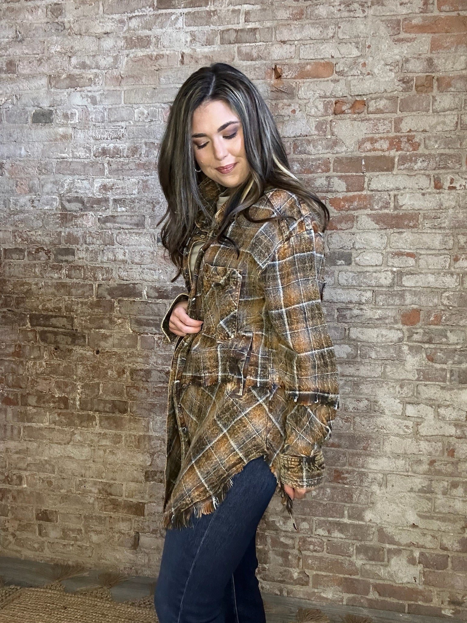 Bring cozy charm to your wardrobe with the Mineral Washed Plaid Shirt in warm brown tones. Its soft, mineral-washed fabric offers a lived-in feel that’s perfect for layering or solo styling. With classic plaid patterning, this shirt adds a playful yet timeless touch to any outfit, making it a go-to for laid-back days and casual adventures.