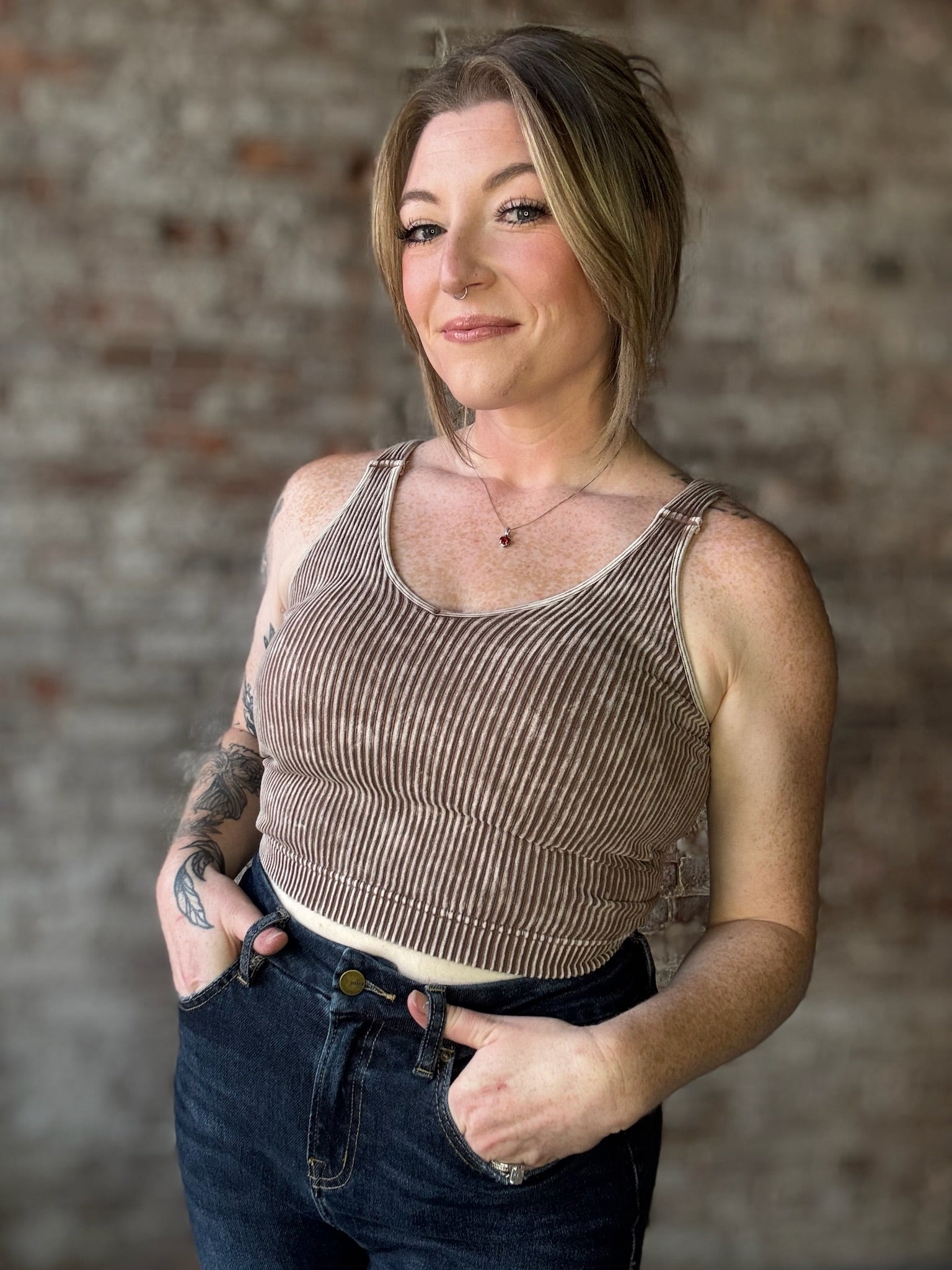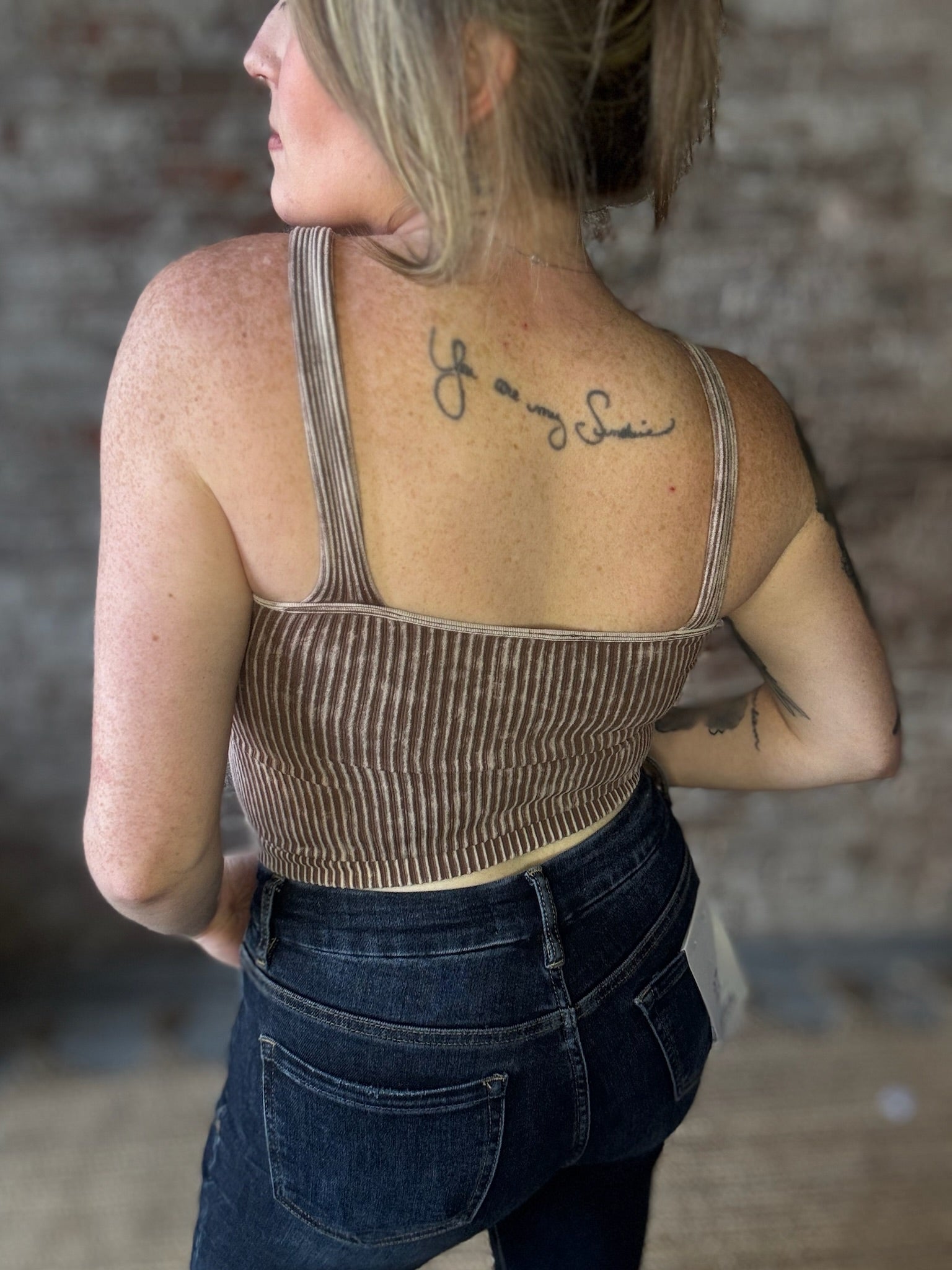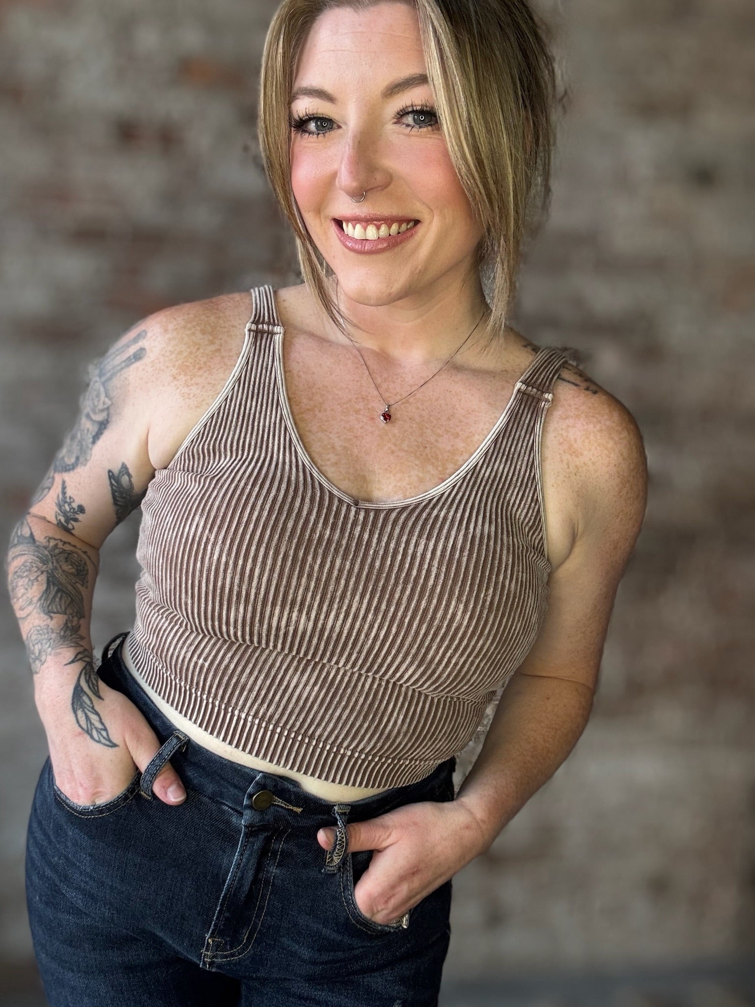 Mineral Washed Ribbed Cropped V Neck Tank with Removable Bra ~ Mocha