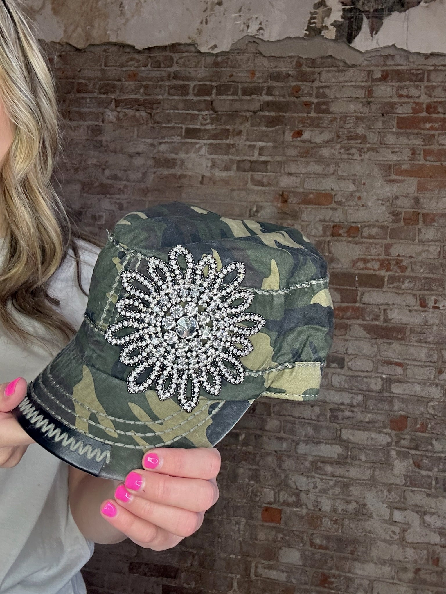 Bling flower hand detail stitched cadet with AB stones, adjustable velcro closure