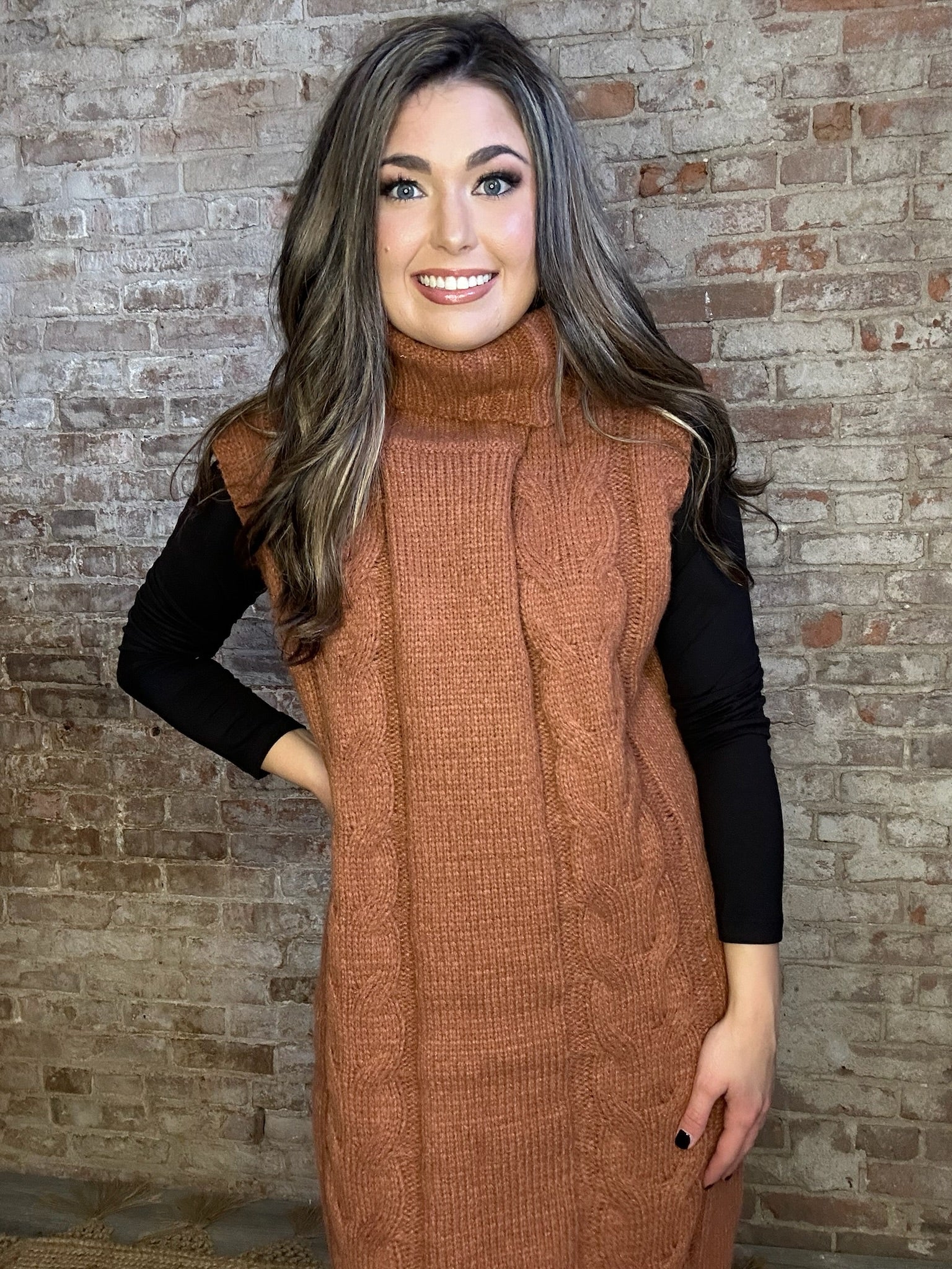 Elevate your wardrobe with this sleeveless turtleneck sweater dress, perfectly blending cozy warmth and sleek style. Its soft, knit fabric keeps you comfortable without bulk, while the turtleneck adds a touch of sophistication. Ideal for layering or wearing solo, this dress offers effortless elegance for any occasion. Embrace versatile fashion that moves seamlessly from day to night.