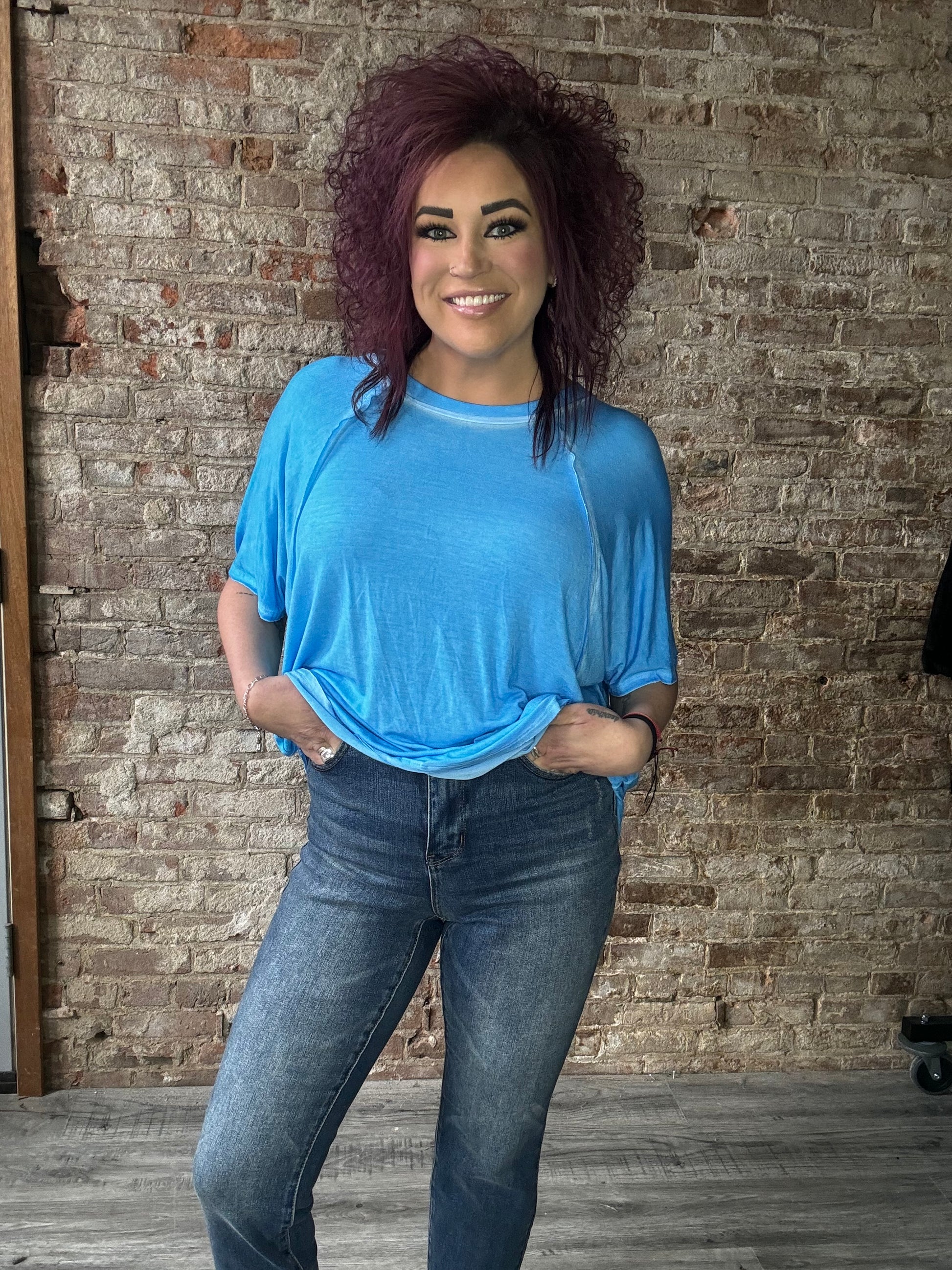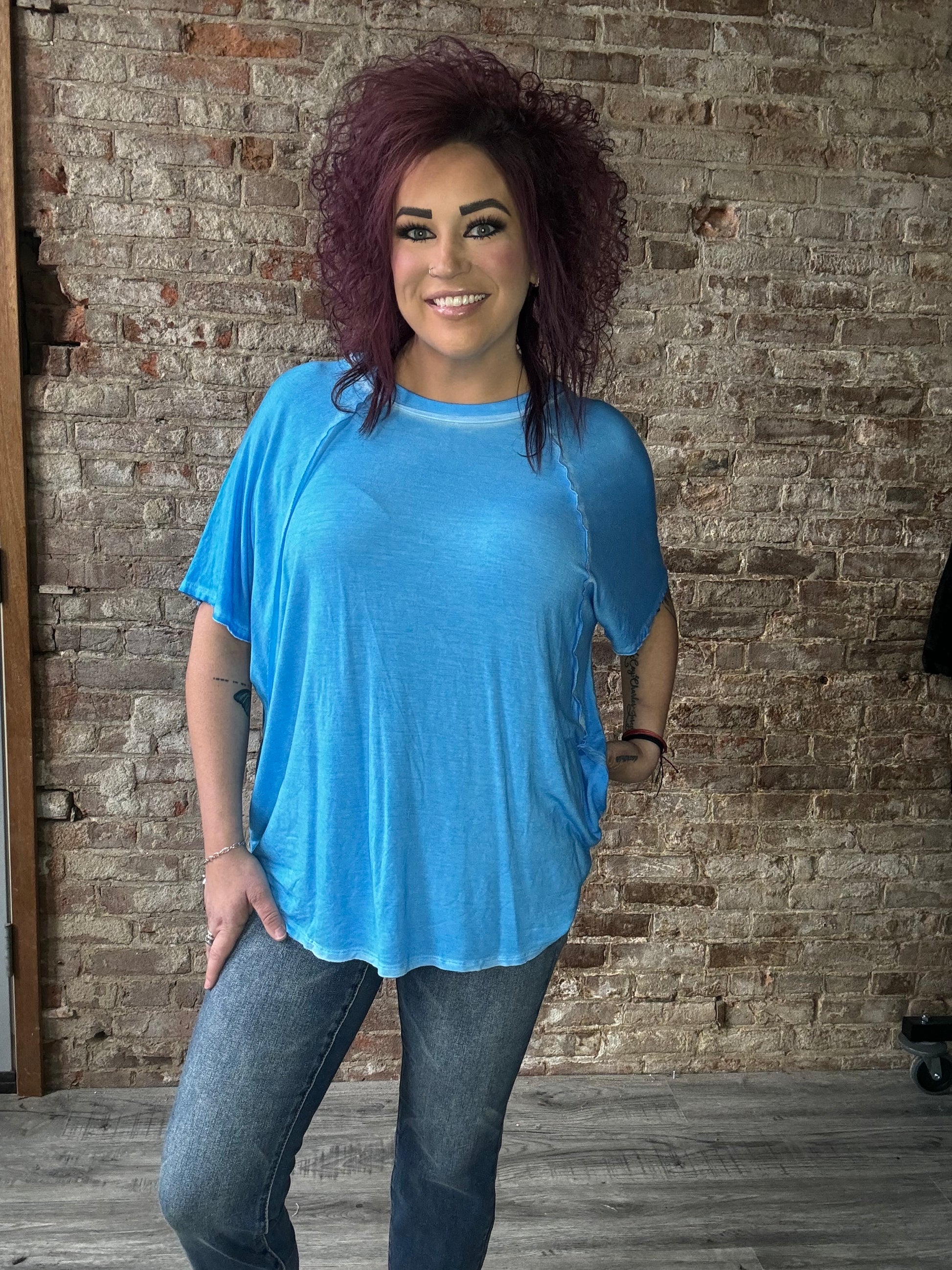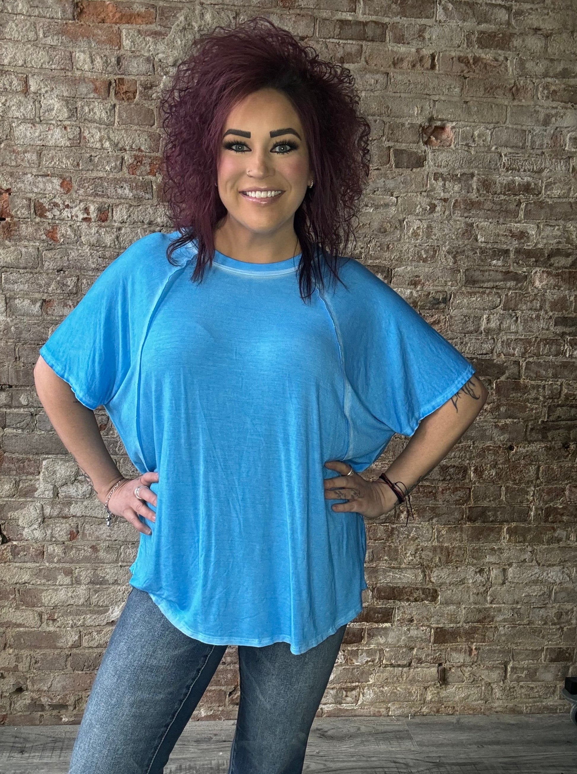 With a hi-low hem this dolman sleeve top is a great staple piece for any wardrobe.